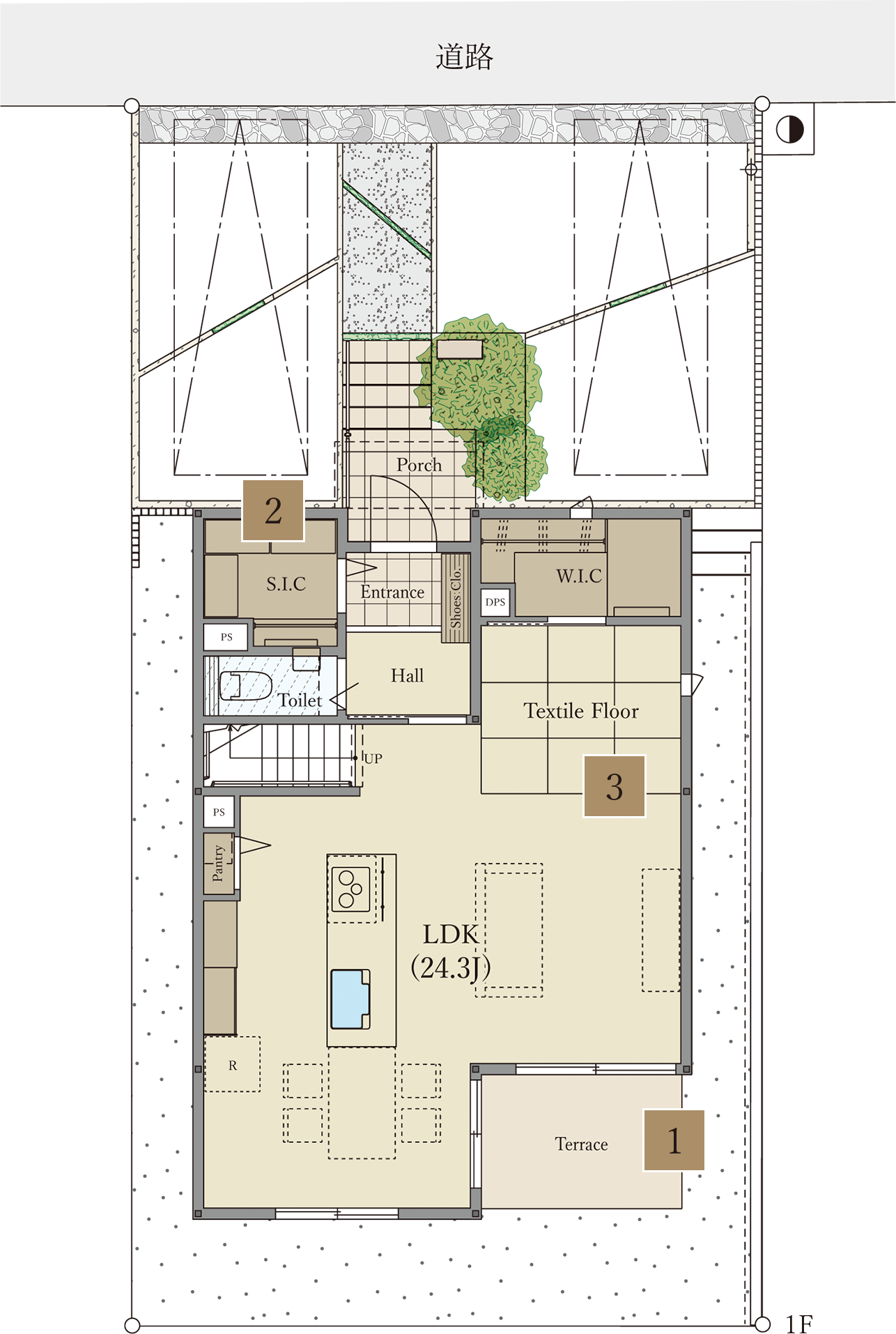 ※掲載のイラストは、図面を基に描き起こしたもので、位置・スケール等は実際とは多少異なります。また、家具・調度品等は販売価格に含まれておりません。 植栽につきましては特定の季節の状況を表現したものではなく、竣工時には完成予想程度に成長しておりません。