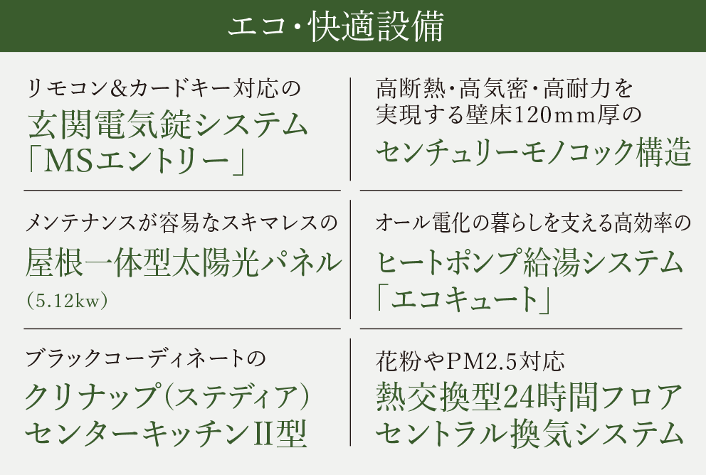 高気密・高断熱の「木質パネル構造体」や「屋根一体型太陽光パネル」、高効率なヒートポンプ給湯システム「エコキュート」などでZEH基準に対応しています。