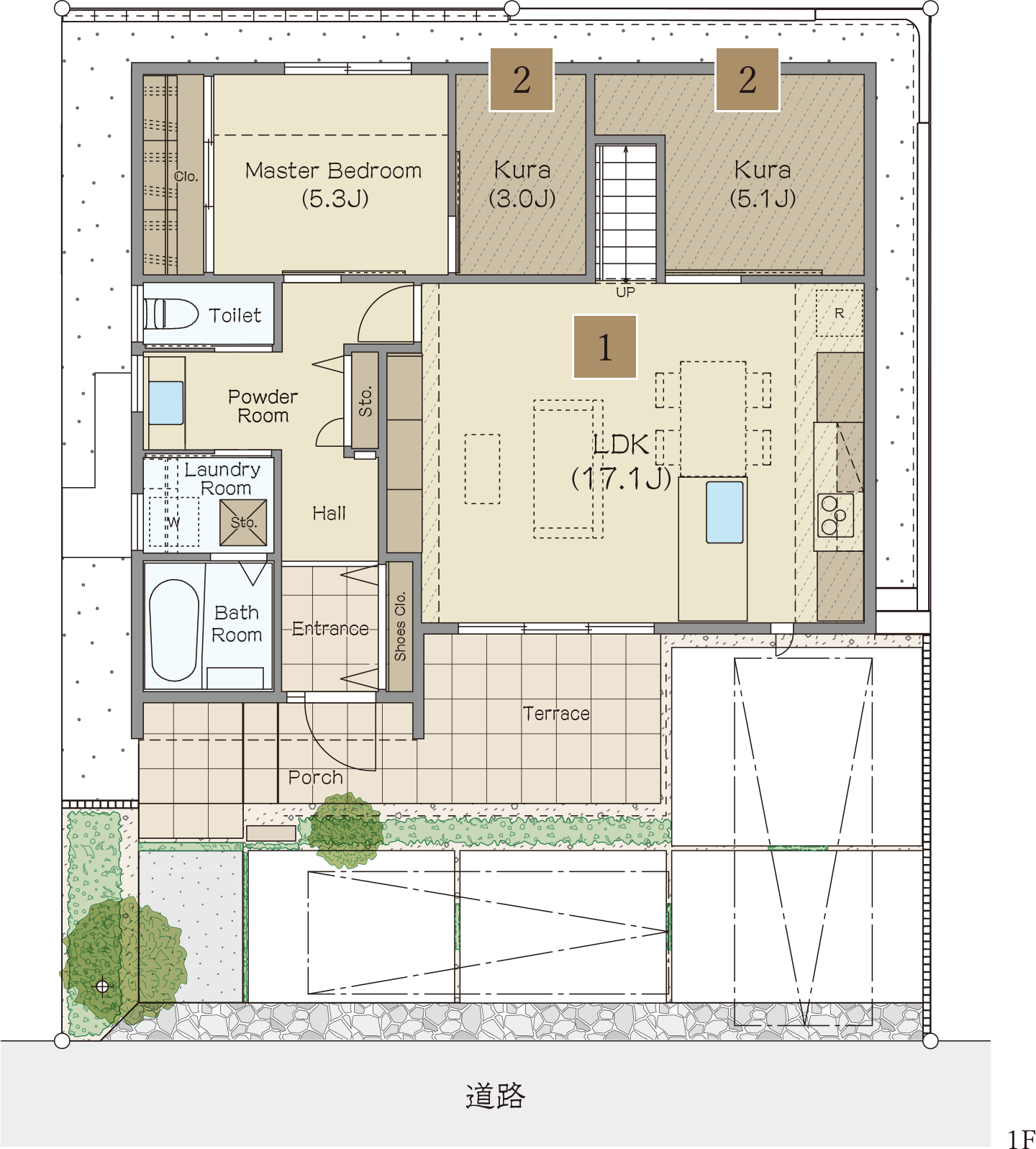 ※掲載のイラストは、図面を基に描き起こしたもので、位置・スケール等は実際とは多少異なります。また、家具・調度品等は販売価格に含まれておりません。 植栽につきましては特定の季節の状況を表現したものではなく、竣工時には完成予想程度に成長しておりません。