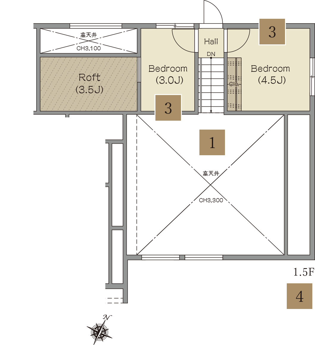 平屋と2階建てのいいとこどりの1.5階建ての住まい。平面的に暮らしつつ約3.3mの高天井&高窓で開放的な空間を演出します。1.5階の洋室はLDKから、ほどよい繋がりです。