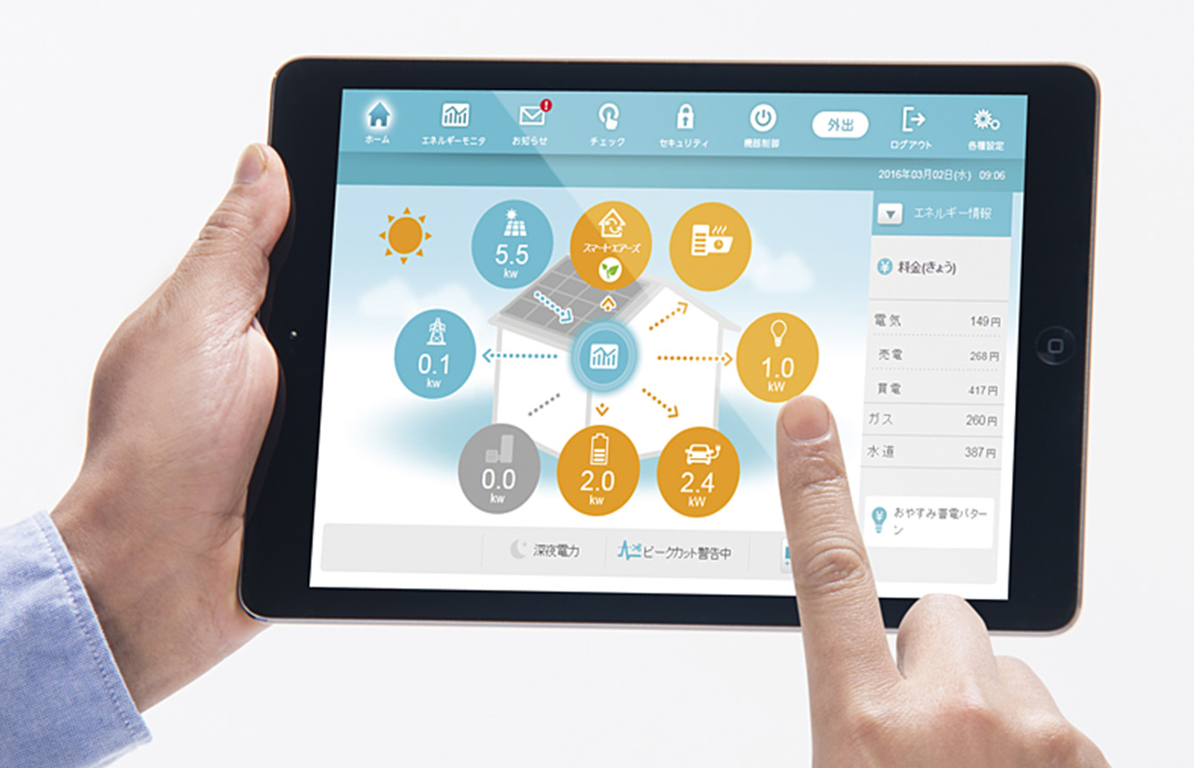 家庭内のエネルギーが、いつ、どこで、どれだけ使用されているかを見える化・コントロールするシステム。エネルギーの有効活用と、ムリのない省エネ行動を促進するとともに、外出先からの機器のコントロールも可能となります。