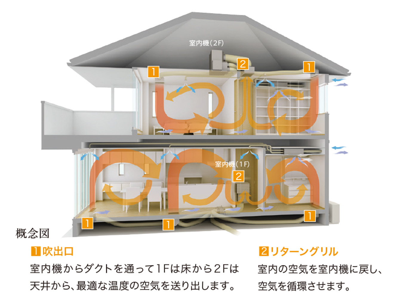 夏も冬も家中どこにいても快適な温度環境を実現。1・2階が独立した2in1システムにより、ムダを抑え効率的に使用できます。