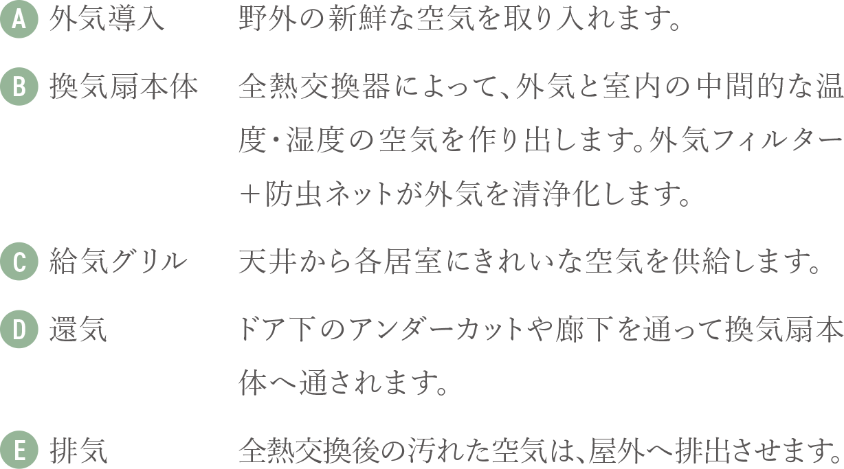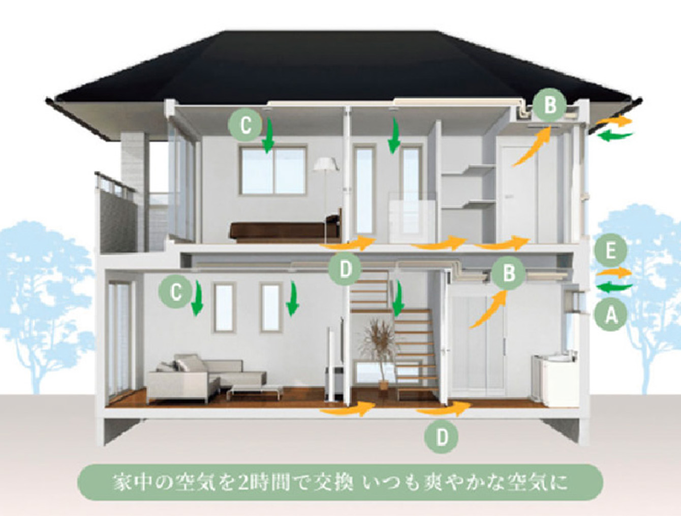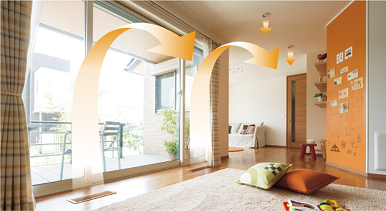 天井裏にダクトを配して、全室を24時間自動的に換気。室内をいつもさわやかな空気で満たします。さらに2時間に1度、「1日に12回」の全館換気で、住まいの空気を24時間ここちよく保てるから、窓を閉め切っていても安心です。