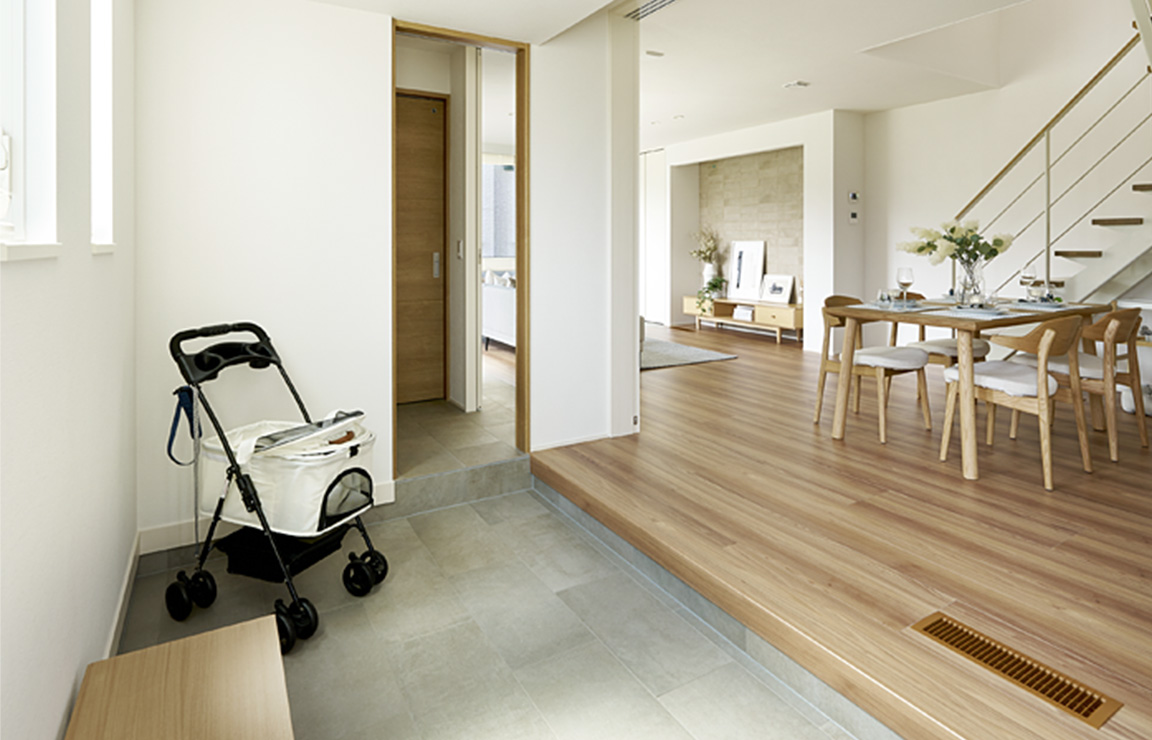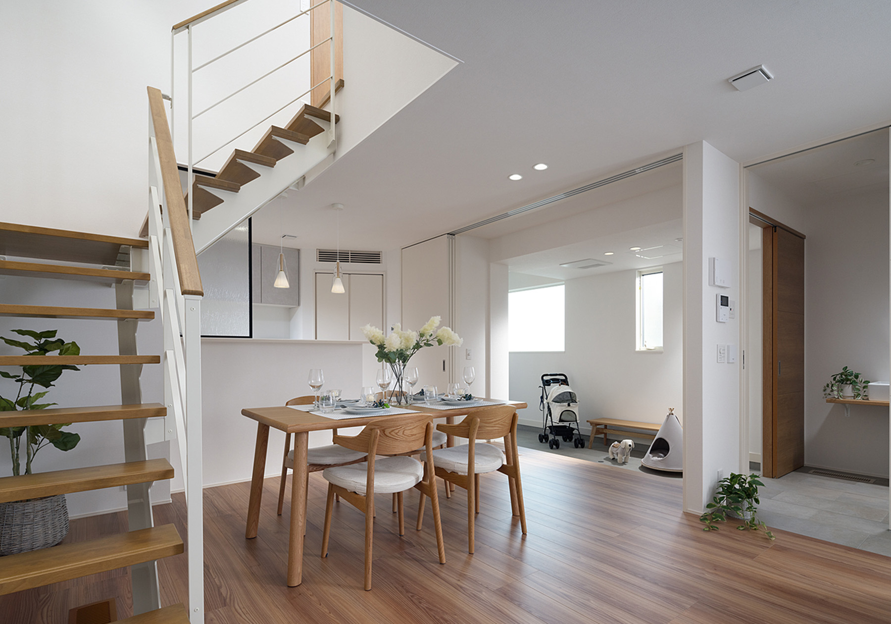 玄関に続く広々とした土間スペースはペットとのふれあいはもちろん、多彩な趣味も満喫できるマルチ空間。さらに土間スペースからの動線やテラスとのつながりなど、リビングにもさまざまな工夫を凝らすことで、人もペットが心地よく暮らせるコンセプトプランとなっています。
