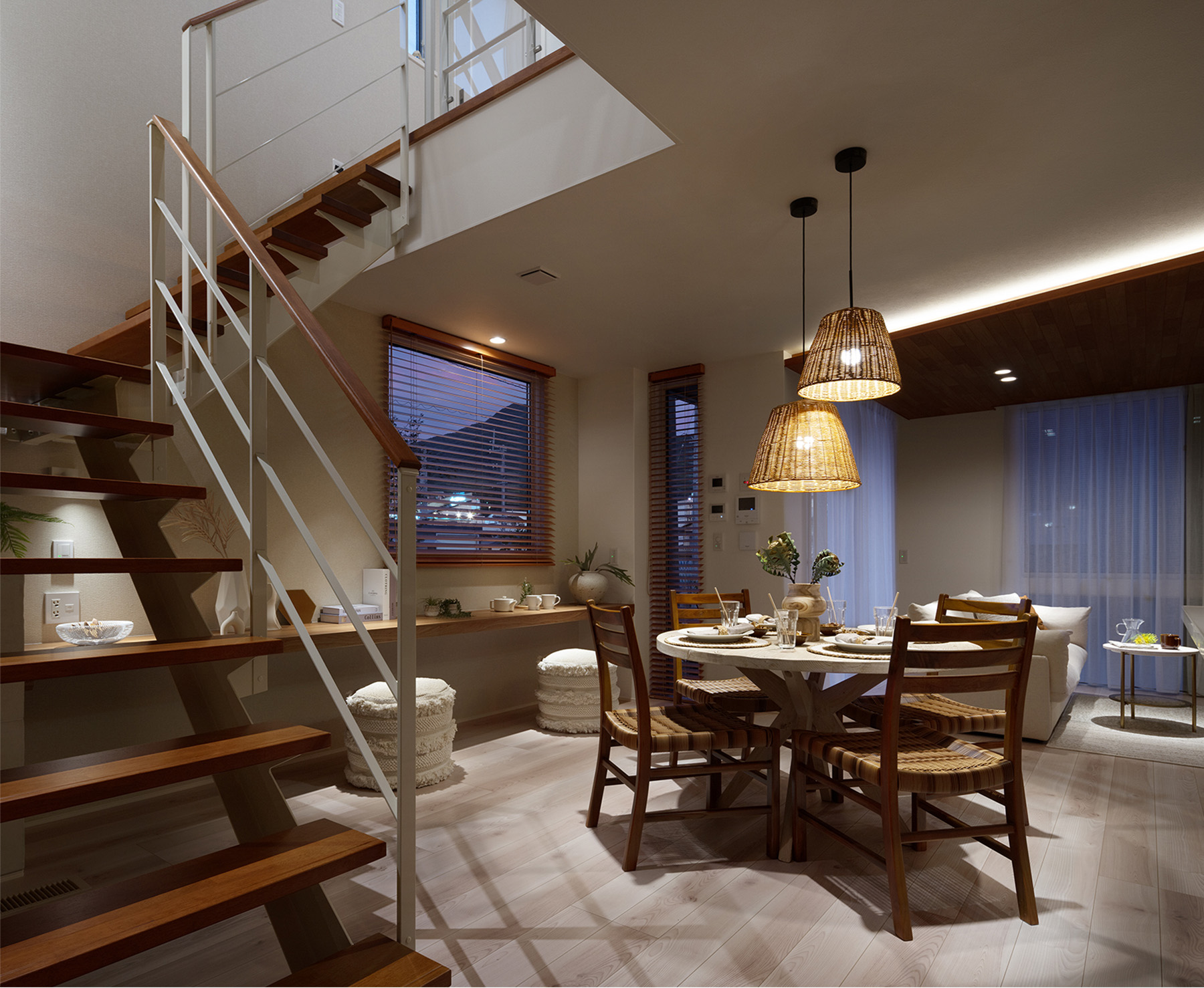 リゾートのような寛ぎを日常に。そんなリラックススタイルを求めるご家族におすすめのコンセプトプラン。開放的な吹抜け空間や自然の風合いを演出する木調の装飾天井など、質感にこだわったインテリアが優雅でリゾートライクな居心地を叶えます。